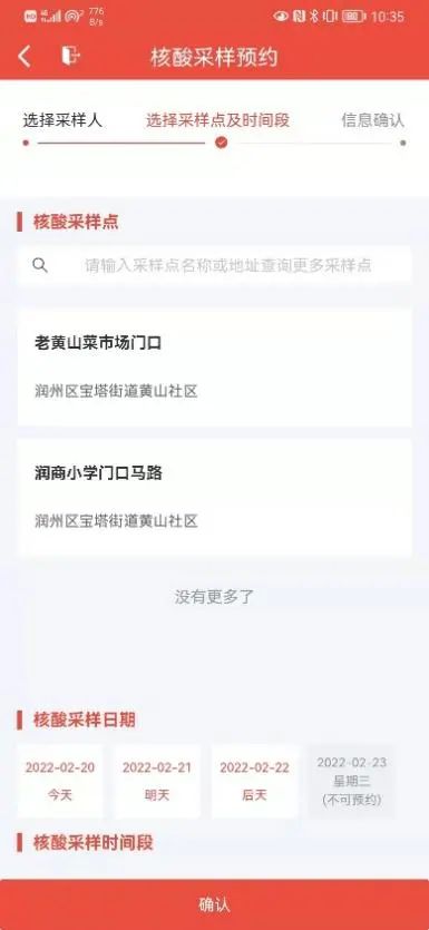3. 完成核酸采样点选择后,在页面下方选择预约日期和预约时间段。点击确认完成采样点和采样时间选择。